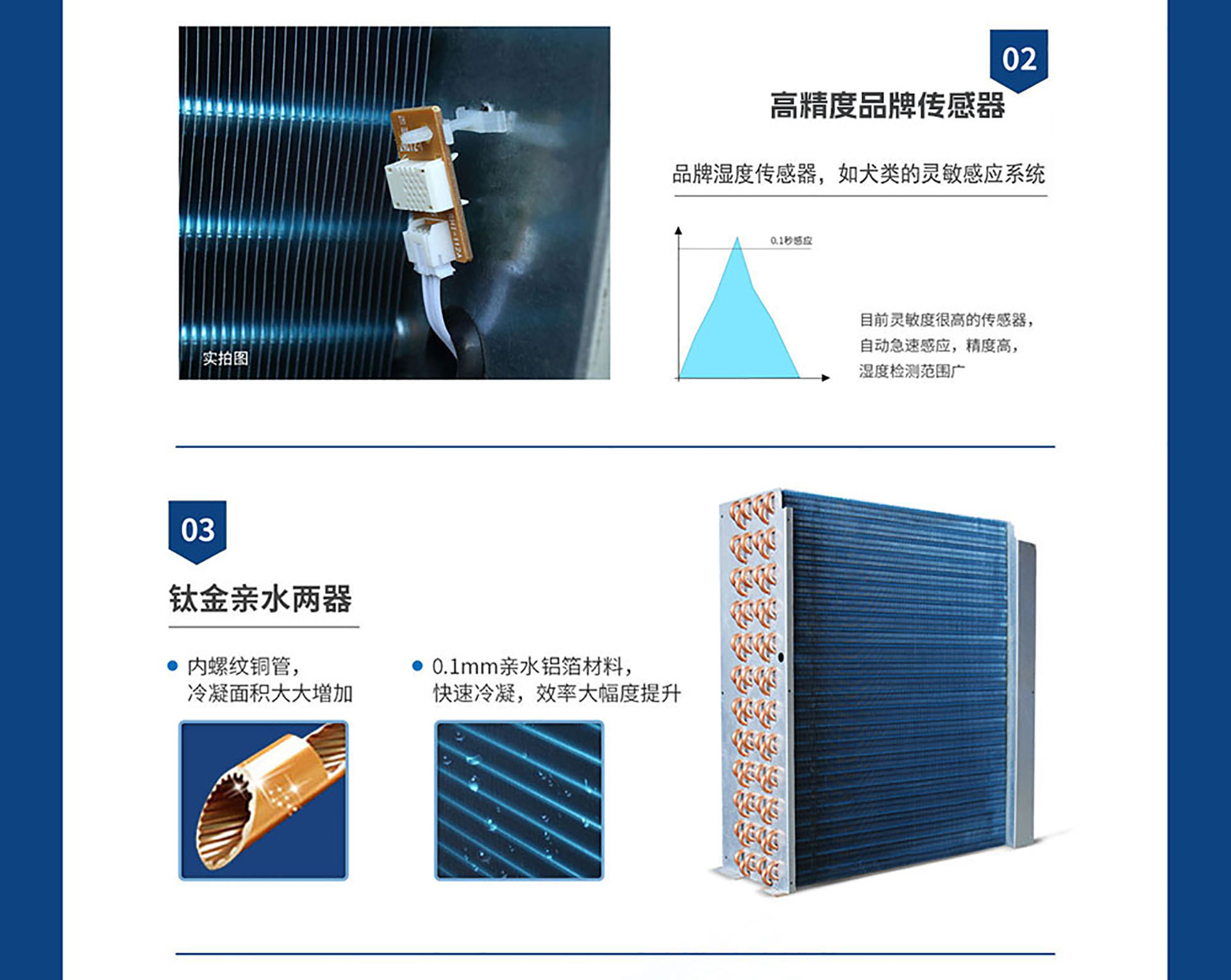 ·涡旋式高效压缩机·压缩机三分钟自动延时保护·高效紫铜管套铝翅片·高效离心风机·湿度任意设·自动除霜功能·湿度与故障显示功能
