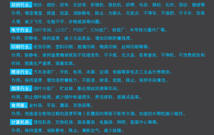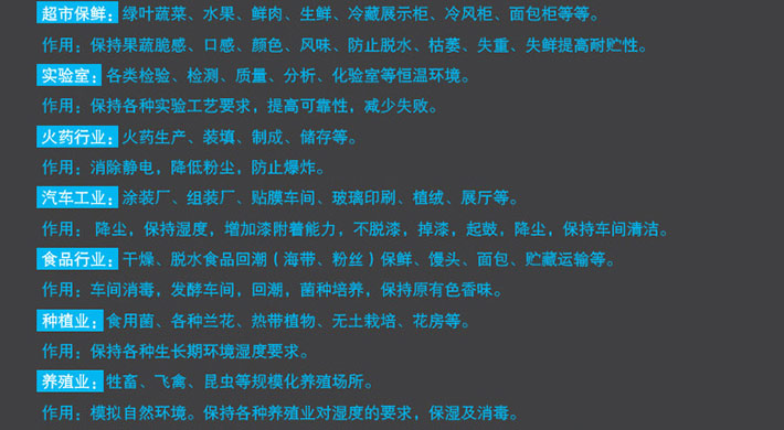 ·湿度控制:当湿度达到设定要求时自动停机,湿度低于设定值时自动开机,设定范围30-90%。