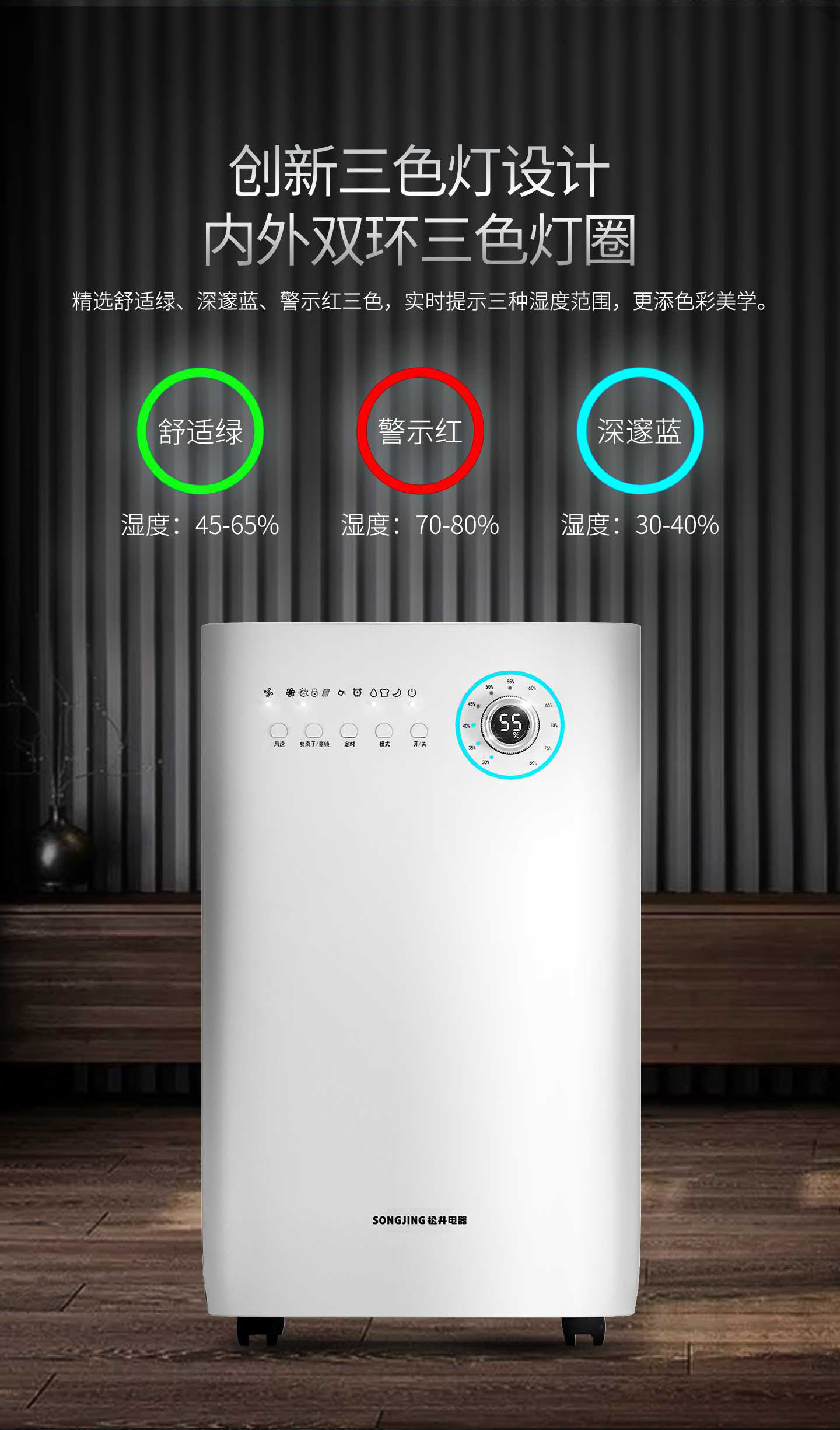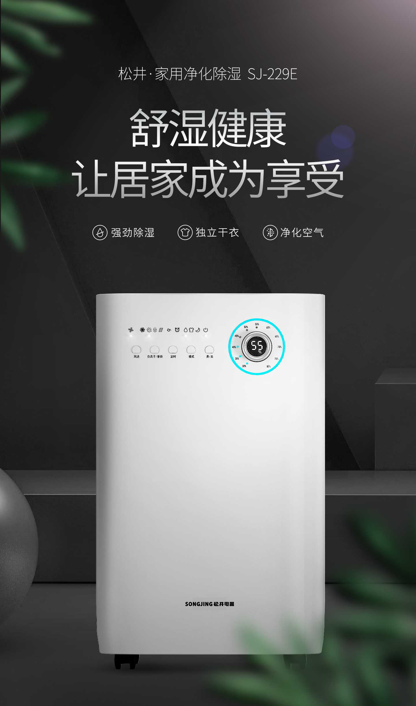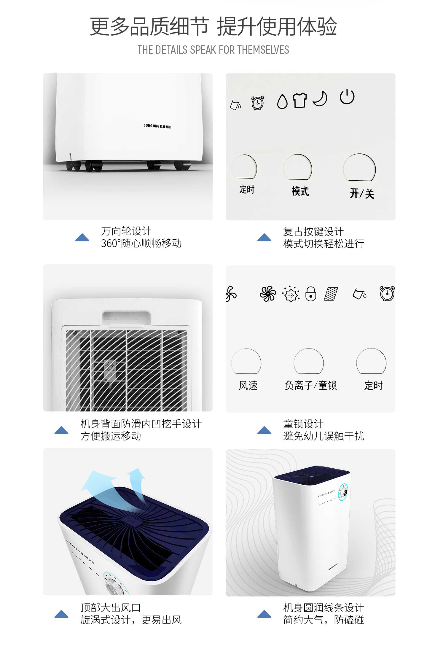 ·强劲除湿·独立干衣·H12级HEPA滤网·负离子净化·光催化净化·轻奢铝制旋钮调节·三色灯环设计·LED湿度显示·功能按键·万向轮移动·童锁设计·定时功能·睡眠模式