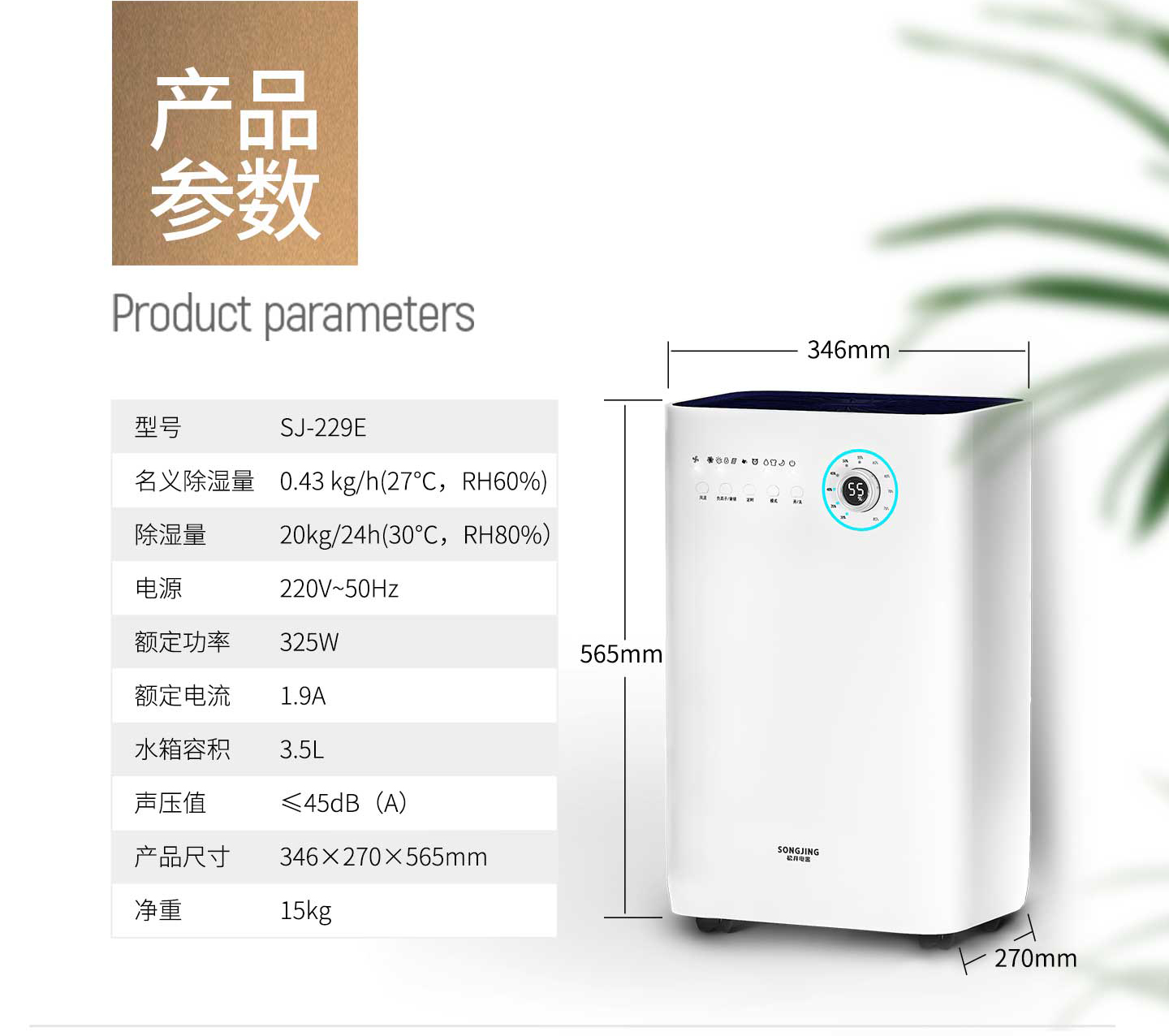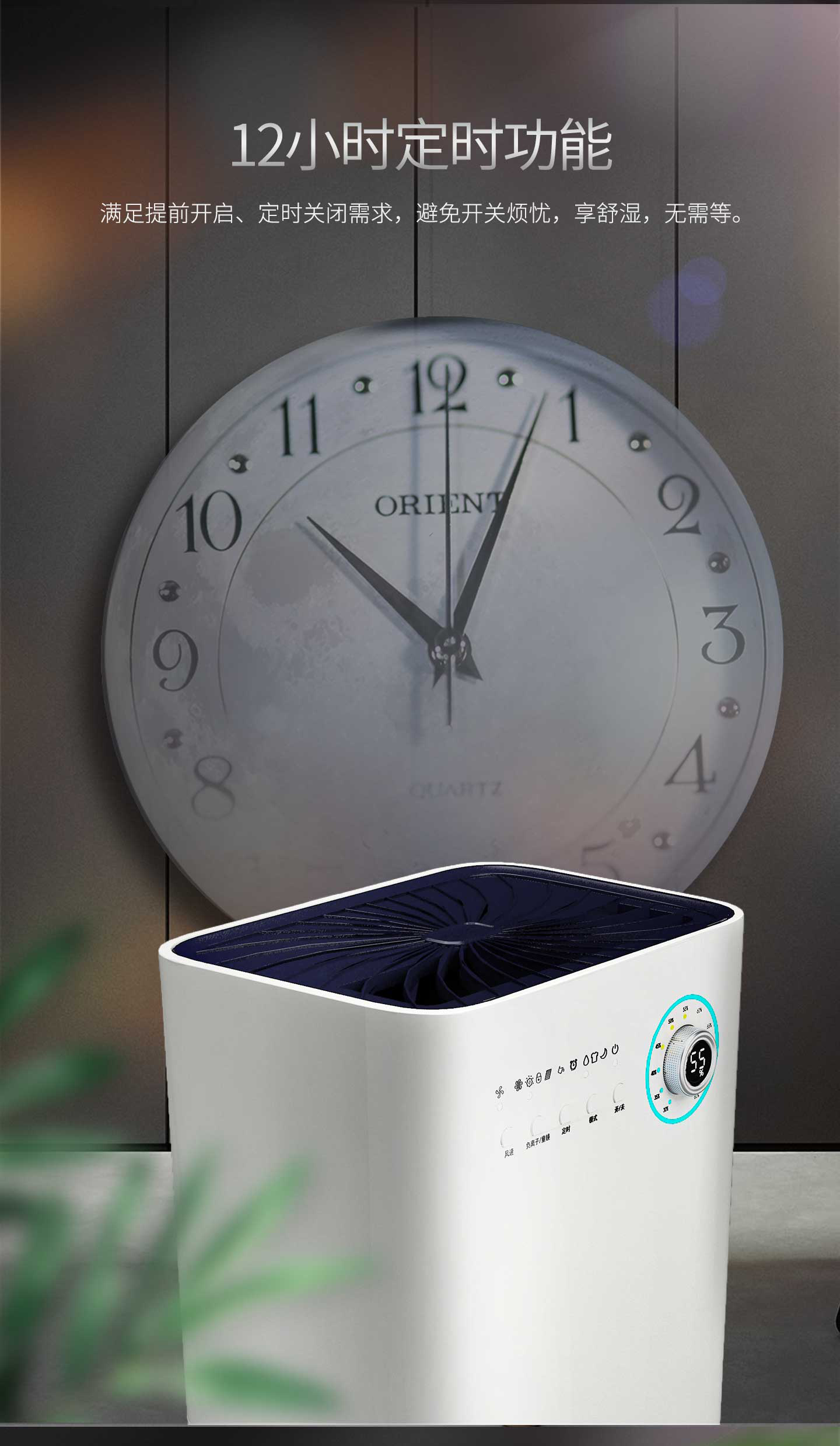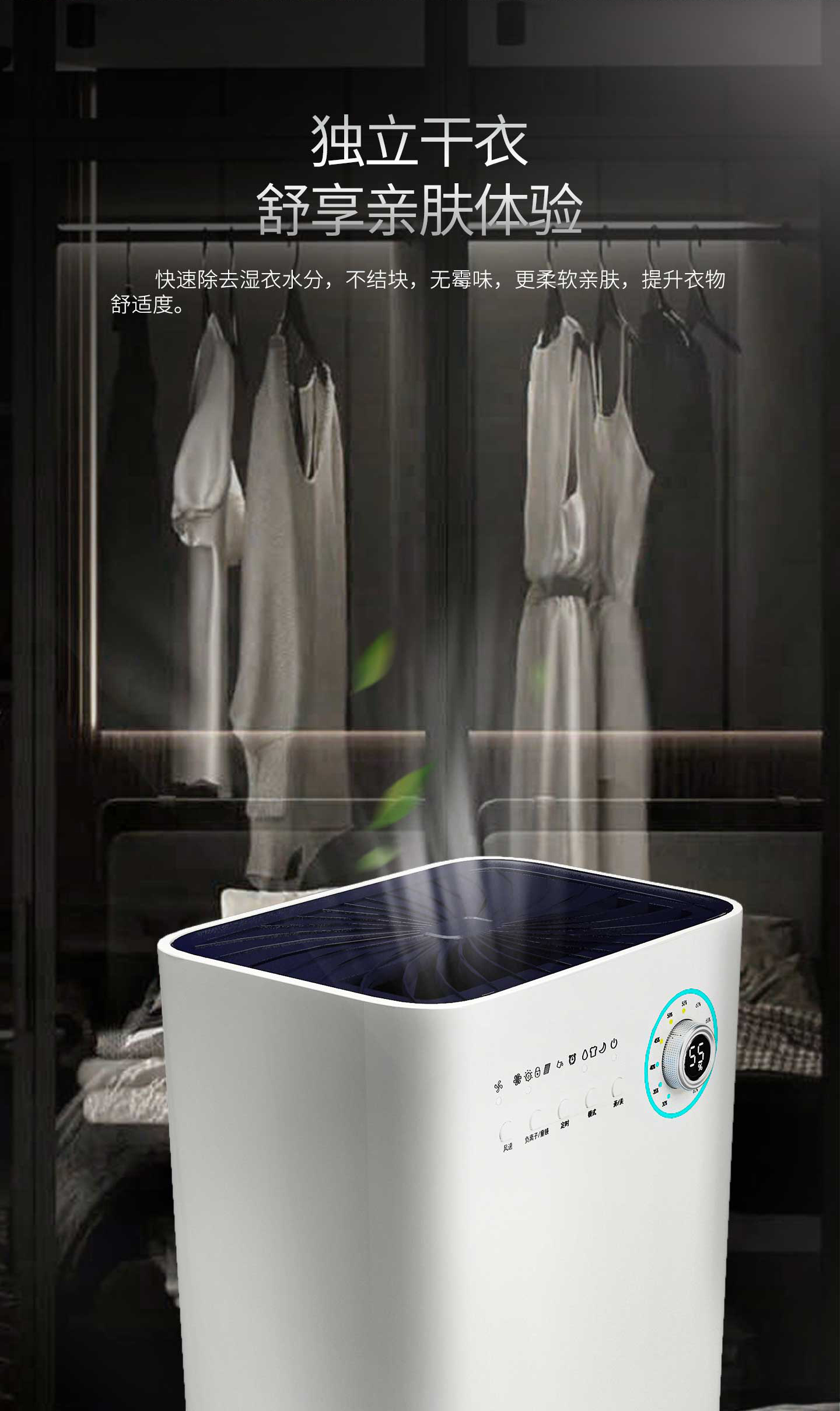 ·强劲除湿·独立干衣·H12级HEPA滤网·负离子净化·光催化净化·轻奢铝制旋钮调节·三色灯环设计·LED湿度显示·功能按键·万向轮移动·童锁设计·定时功能·睡眠模式